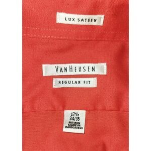 Tough stains don't stand a chance with Van Heusen's Stain Shield dress shirt. Its extreme stain defense works against water- and oil-based spills—when accidents happen, just rinse with running water. The innovative style is made from soft, quick-drying fabric that features added stretch for even more comfort.  Van Heusen says this color is red but it looks more grapefruit to me - maybe it is sateen.