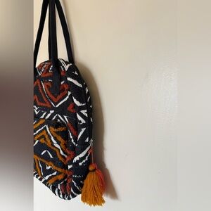 Adorable vegan bag. Double straps. Front zipper. Two interior pockets. Two orange tassels. Perfect as a purse, travel bag, beach bag, etc.
