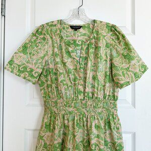 Brand new Velvet Heart Stilla Jacobean Floral Dress. This romantic and playful mini dress is a must-have for the summer season. Features a v-neck, short sleeves, smocked waist, pleat detail, ruffle hem, and lightweight cotton fabrication. Color: Green/Pink. Size: Large. Material: 100% Cotton. Excellent condition. Never worn. New without tags.