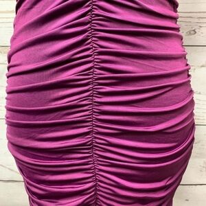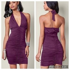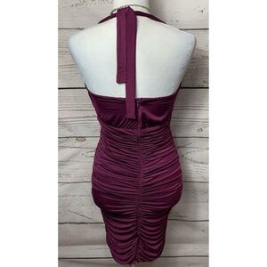 V-neck Halter tie Back zipper Ruched Lined Plum color Chest 21” Length 34” Size XS NWOT!