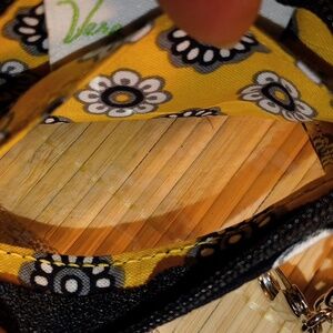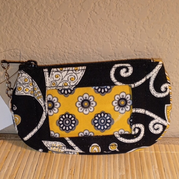 This Vera Bradley pouch showcases a striking black and yellow floral pattern, perfect for adding a touch of elegance to your ensemble. This retired print is Yellow Bird. Crafted from high-quality fabric, it features a secure zipper closure and a compact design ideal for carrying essentials. The intricate medallion and swirl motifs lend a modern yet timeless appeal to this stylish accessory. ID slot. Lined printed interior. Chain link and clasp attached to zipper. Attach to belt loop, purse, key chain, etc. Room for ID and credit cards, lipstick, etc. New without tags, not used. Excellent condition.