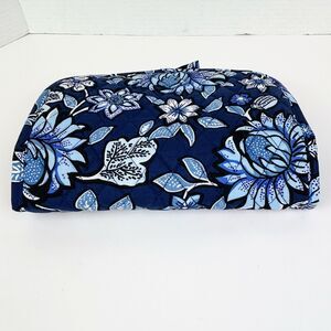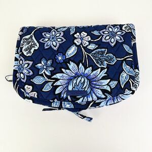 Vera Bradley medium travel organizer in Tropics Tapestry, a blue floral pattern. Keep your toiletries and makeup organized on the go with this folding case with a top hook for hanging. Made of quilted fabric with interior clear PVC pockets. Unroll the case to reveal a top divided zip compartment, two shorter middle divided zip compartments, and a bottom more roomy zip around section. Keep everything neat with the top tie closures that allow the bag to stay compact in your suitcase. Brand new, unused, tag not attached but still inside bag, original packaging tag loop still attached to zipper. Approximate measurements: 19.5" length when open, 9.5"L x 6.5"H x 2"D (when closed).
