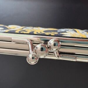 • Closure: Polished silver-tone metal frame with double ball kiss-lock clasp