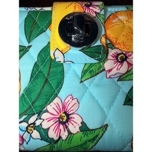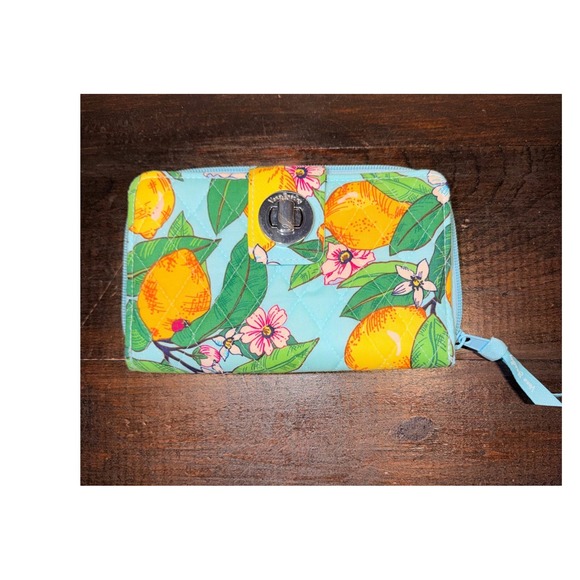 Vera Bradley zip around wallet in a vibrant lemon and floral print on a light blue quilted background. This wallet features a secure turn-lock closure and a convenient zip-around closure for all your essentials. Inside, you'll find multiple card slots, bill compartments, and an ID window, along with RFID protection to keep your information safe.