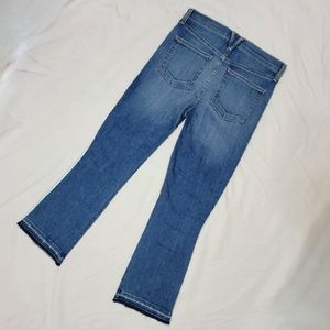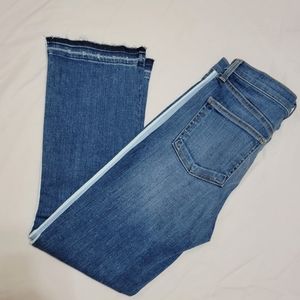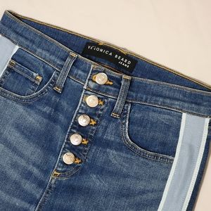 New without tags Veronica Beard jeans size 27. Style is Carolyn Baby Boot high rise. Features a distressed hem, 5 buttons, and a light blue stripe on the side. Inseam is 25in. #veronicabeard #bootcut #distressed #luxury #denim