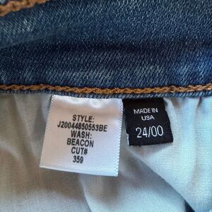 The Carolyn features a high-rise silhouette with an exposed button fly and dolphin hem. Slight fading adds an effortless and downtown-chic look to this flattering style. Thanks to our Secret Skinny Pockets, this is the best you've ever looked in jeans. The pocket construction utilizes stretch fabric for a slimming effect that will ensure a perfect fit.