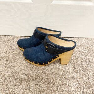 NWOT Veronica Beard Dacey Denim Leather Buckle Mule Clogs Heels Size 6.5