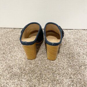 Veronica Beard Dacey Denim Leather Buckle Mule Clogs Heels Size 6.5