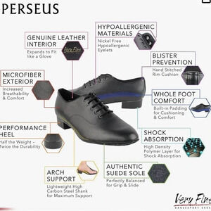 Very Fine Perseus Ballroom Dance Shoes Featuring: BlisterGard edge cover to help protect against chaffing and blisters in your ankle area. Soft leather lining for the ultimate in comfort. High quality suede on the outer sole for the perfect amount of traction and slide. High quality leather insole for durable wear.