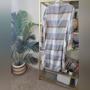 Women’s size large. Collar, checkered plaid blue cream grey and brown camel print. 10% wool; 90% polyester exterior. Long sleeves. Long coat. Relaxed fit. Closes into a vneck. Looks great paired with skinny jeans or leggings and boots. Has pockets! Light weight and perfect for the holiday, Christmas and winter season.