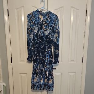 This elegant Vici dress features a striking blue and white pattern, perfect for a wedding guest or cocktail event. The sheath style is complemented by long sheer sleeves and a sophisticated mock neck, creating a refined and stylish look.
