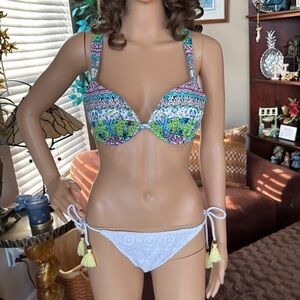 NWOT Victoria's Secret Bikini Pushup Bra Top 34C & White Crochet Tie Bottoms Medium.