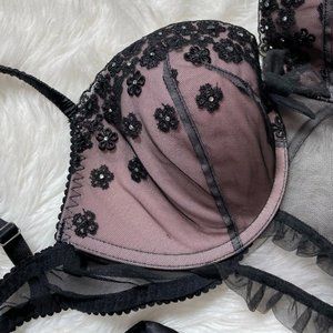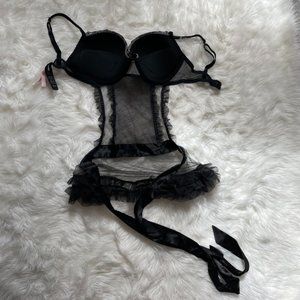 NWOT, purchased years ago, Unworn, excellent condition, Victoria's Secret French Maid Sheer Mesh, Ruffle trim, Embroidered flowers with center Sequins, push up, Ribbon Belt Back Tie, exposed back, adjustable bra straps, Black 36D