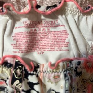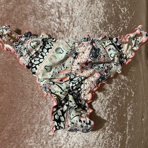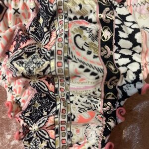 Never worn. Back is cheeky. Very tiny fit. Has metallic detailing throughout. Very pretty print. Ruffle trim throughout. Elastic like new.