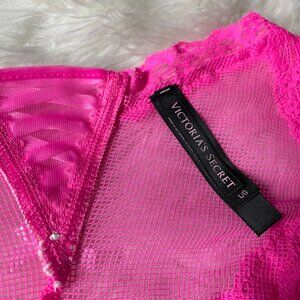 RARE Vintage Victoria's Secret, very sheer Hot Pink mesh lace, White ribbon corset lace-up back embellishment, Never worn, excellent condition, Size Large