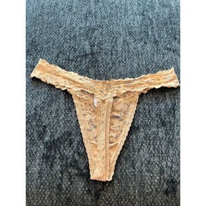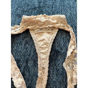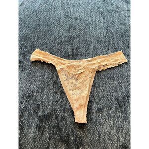 A delicate lace thong from Victoria's Secret, featuring intricate floral patterns. The item is designed for comfort and style, suitable for everyday wear.