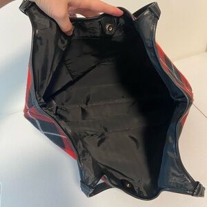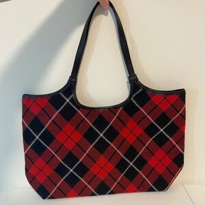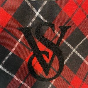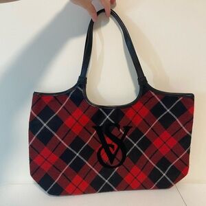 Victoria’s Secret tote bag. Bag is red and black plaid patterned with fuzzy VS lettering on the front. Has a wide open interior with an open pocket on the side. Shuts magnetically. Smoke free home!