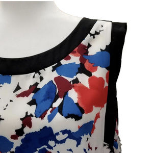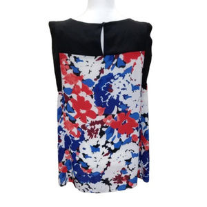 Vince Camuto Floral Print Blouse (Blue, orange, purple, white & black). Button and loop closure at back. Polyester. Machine washable. Size: XL. Aprox. Measurements: Bust: 44”. 26” long. A chic top for work or weekends. Excellent condition, new with out tags (See photos). Smoke free, pet free home.