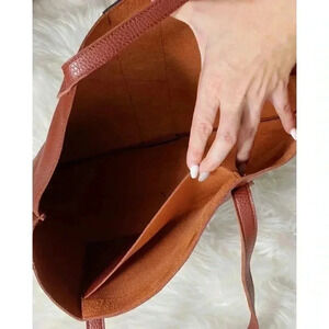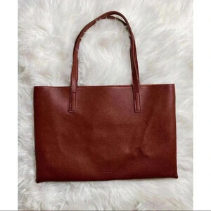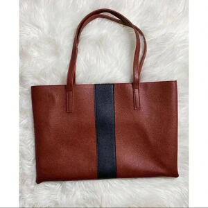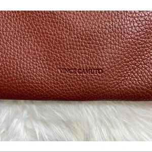 NWOT, unused brown vegan pebbled leather Vince Camuto Luck tote. 17”W, 11.75”H, 1.5”D. Black contrast panel down the middle. Features unlined sueded interior with hanging slip pocket and embossed Vince Camuto on back. Perfect as laptop bag.