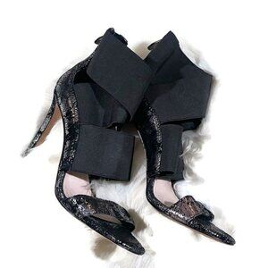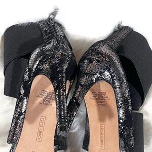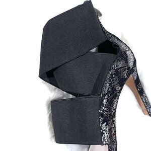 NWOT Vince Camuto Strappy Ondetti Black/Silver Metallic Stilettos with Elastic Straps, Back Ankle Zipper, 4’ Heel, Leather and Fabric Materials, Leather Sole Size 6