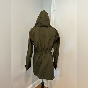 NWOT Vince Camuto Women’s Medium Jacket Dark Green. Full Zip. Removable Hood. Unlined mid length. Medium weight. Hand warmer pockets. Buckle cuffs. Orange contrasting trim. Adjustable wear waist drawstring. No rips, stains or defects. Please see pictures for measurements.