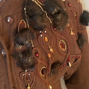 It is 70% lambswool, 20% Angora rabbit hair, and 10% nylon. It is fully lined and has shoulder pads. This has never been been worn. All buttons are intact. Embellishments include faux gemstones, beads & fur.
