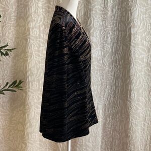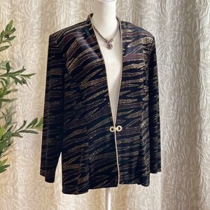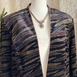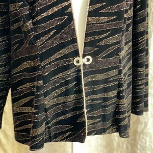 Description: gorgeous black, gold, and silver sparkling zebra print evening jacket with gold tone front clasp closure and shoulder pads by R&M Richards in US women’s size 18.
