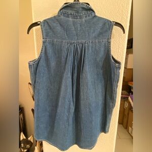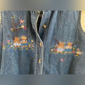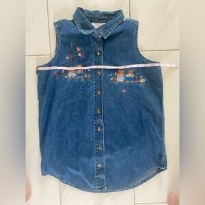 Vintage Embroidered Bear Family Fishing.. Size Small , Collard Blue Denim Sleeveless, Button up shirt