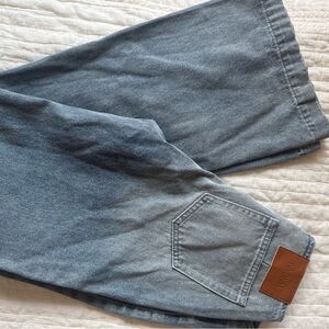 These blue jeans boast a wide-leg flare design, offering a chic and relaxed silhouette. The vintage wash adds a timeless touch, while the rigid denim provides an authentic feel. Perfect for casual outings, they combine comfort with style.