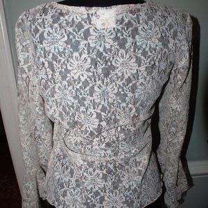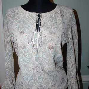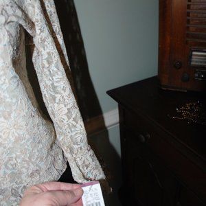 100 per cent Nylon, ivory, brown, blue threads in the lace with tags and bell sleeve with ribbon tie. Really pretty!