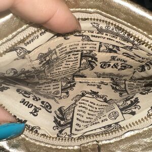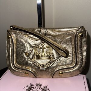 This vintage Juicy Couture wristlet is a must-have for any fashion-forward woman. Made of genuine leather, this pink clutch wallet is perfect for carrying your essentials on a night out or for everyday use. The metallic gold color and solid pattern add a touch of glamour to any outfit.