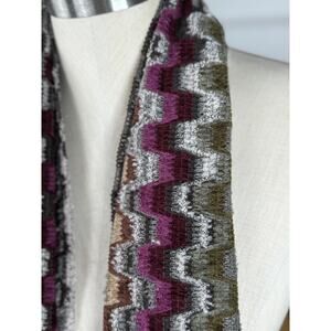 Vintage Missoni scarf with geometric zig zag pattern. This Missoni zig zag scarf can also be worn as a shawl or wrap. Gorgeous purple and green multicolor pattern. Made in Italy. Lightweight wool/acrylic/nylon blend is comfortable to wear in any season. 72" x 17".