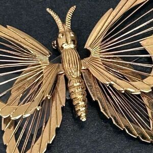 This estate sale find Monet Butterfly Brooch from 1961 exudes classic elegance with its triple gold-plated finish and intricate openwork wire filigree design. This uniquely dimensional piece captures the beauty of a butterfly, symbolizing joy, warmth, and transformation. Featuring a secure safety-catch pin closure and signed Monet.
