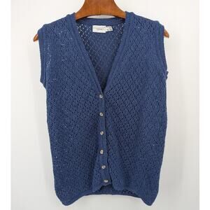 Vintage Van Heusen open knit sweater vest in size XL (see measurements below). Made in the USA from 100% cotton. This deep blue layering piece features a diamond eyelet knit design, full button front, and sleeveless silhouette—perfect for cottagecore, vintage, or retro-inspired outfits. Ideal for layering over tees, dresses, or turtlenecks.