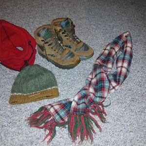 in this bundle you will receive four items ranging from Unisex LLbean thinsulate hiking boots men's size 7, women's size 8.5, Carhartt beanie, and thinsulate baklava and a nice wool scarf.