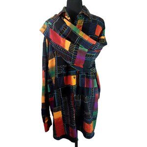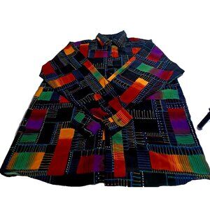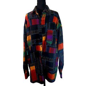 This Vibrant vintage 80s Men's Panhandle Slim colorful Western button-down shirt in XL size features a collared neckline and button closure, making it perfect for a variety of occasions including travel, casual wear, work, and business meetings. The shirt has a slimming fit and is made in the United States, with a western theme that adds a unique touch to any outfit. It is a part of the Avante Garde product line, suitable for all seasons and adding a retro flair to your wardrobe.