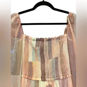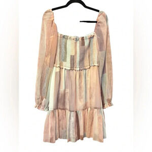NWOT WILFRED Tempest Dress Square Neck Long Sleeve Smocked Bodice Ruffle Skirt M - Mauve Gray Sage Green Print - Sheer Sleeves Elastic Back