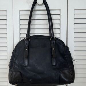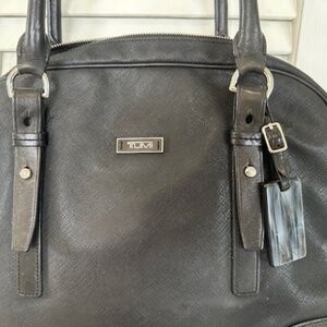 TUMI BAG: TWO (2) 12" ADJUSTABLE ROLLED LEATHER STRAPS , REINFORCED LEATHER ON LOWER AREA OF BAG, SILVER HARDWARE, LARGE OUTSIDE REAR DEEP POCKET, FOUR (4) INSIDE POCKETS, EXTRA LARGE INTERIOR AREA, ZIPPERED CLOSURE