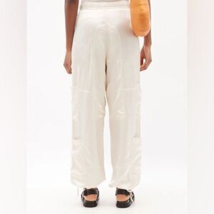 Wales Bonner ‘Spirit’ satin straight leg cargo pants in off-white. Size 1, which fits best XS/S. Brand new without tags. Retail $685, sold out everywhere. From Volta Jazz collection.