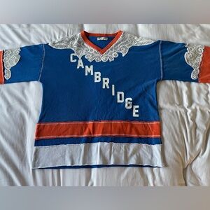Features: Thick jersey fabrication, wide, drop-shoulder ¾ length sleeves, V-neckline, contrast seams, sporty graphics, lace inlays