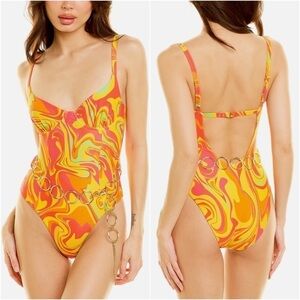 NWOT WeWoreWhat One Piece Swimsuit Danielle 3.0 Retro Swirl Gold Chain Belt Cherry Red Multi XS