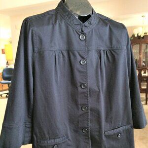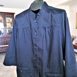 This is a NWOT Westbound black polished cotton jacket in a Missy size XL. It is new and unworn, but the tags have been removed. Fabrication is 98% cotton and 2% spandex for just a bit if stretch. It features a small collar, button front closure, front and back yoke, roll type 3/4 length sleeves, 2 front hip pockets with button and tab closure, and a back tab with button detail. It is unlined with small gathers under the front yoke. It measures 23 inches across under the arm and 27 inches from the shoulder to the hem. Washing instructions are to machine wash cold and tumble dry low. This is a very nice moderate weight black jacket. It is casual enough that it can be worn with jeans for the weekend. Or you could wear it with a pretty camisole and skirt for work. It is really versatile with so many uses. The perfect addition to your Fall wardrobe.
