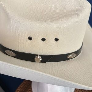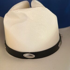 Stylish Detailing: Elevate your look with a sleek black hatband adorned with silver conchos, adding a touch of rustic charm to any ensemble.