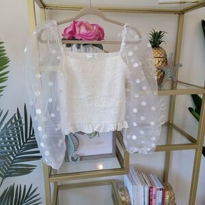 NWOT White Polka Dot Organza Statement Organza/Sheer Long Sleeve Top - Size Large
