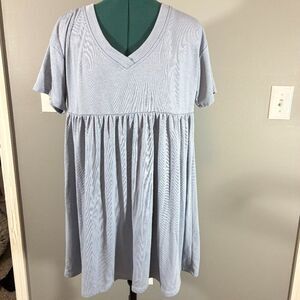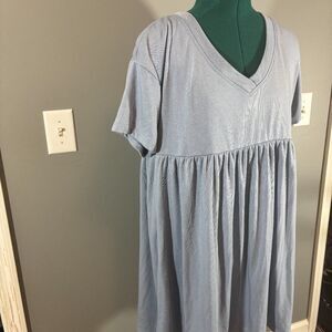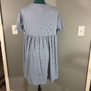 NWOT - never worn. Short sleeve v neck dress made from soft fabric with a sweatshirt like stype. Babydoll silhouette with a cinched waistline for subtle shaping. Terry cloth - like material on the inside. Size Small. Light grayish blue high, empire waist sweatshirt style tunic / mini dress. Perfect to wear with leggings. Very loose and flowy.