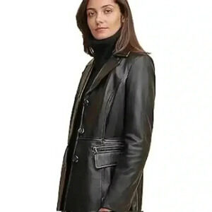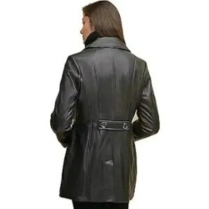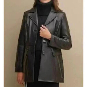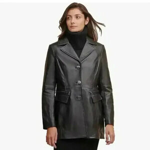 Your personal style soars with this versatile leather coat from Wilsons Leather. It is designed with a button placket, flap pockets, and a flattering waist detail on back. The simplicity of it makes it pair equally well with professional attire and casual denim. All our Wilsons brand jackets are timeless basics with a comfortable fit. Runs true to size.