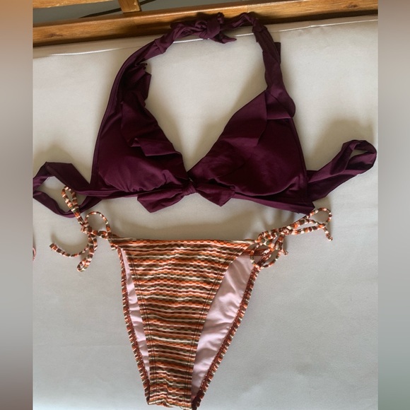 NWOT bikini-wine colored halter style top size medium & small striped bottoms that tie on the side-super sexy tanga!