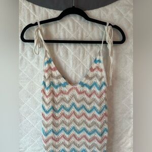 Cream, tan, blue and pink. Self tie straps. Lining is shorter than the entire dress. Classic and gorgeous.