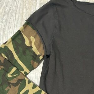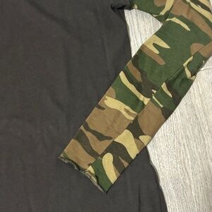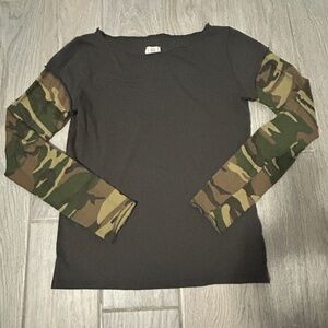 NEW WITHOUT TAGS, PURCHASED AND NEVER WORN! Women's Urban Outfitters, BDG brand layered long sleeve tshirt. Gray thin t-shirt with raw hemmed crew neck line, camo patterned long sleeves built in. Great looking for fall, thin, soft, lightweight. SIZE - MEDIUM
