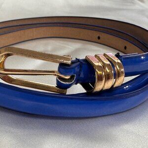NWOT Women's Blue Skinny Belt with gold buckle. 5 belt holes